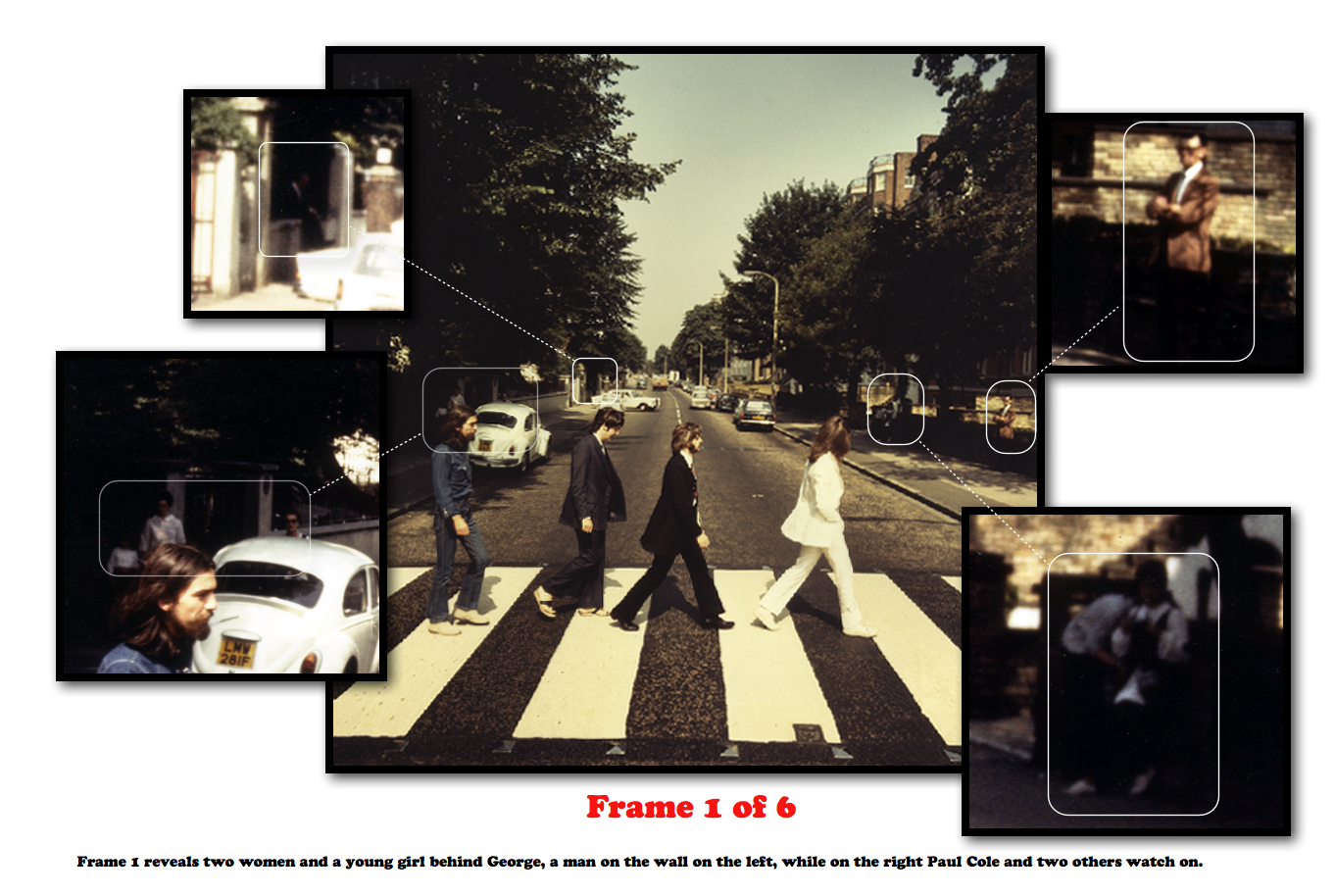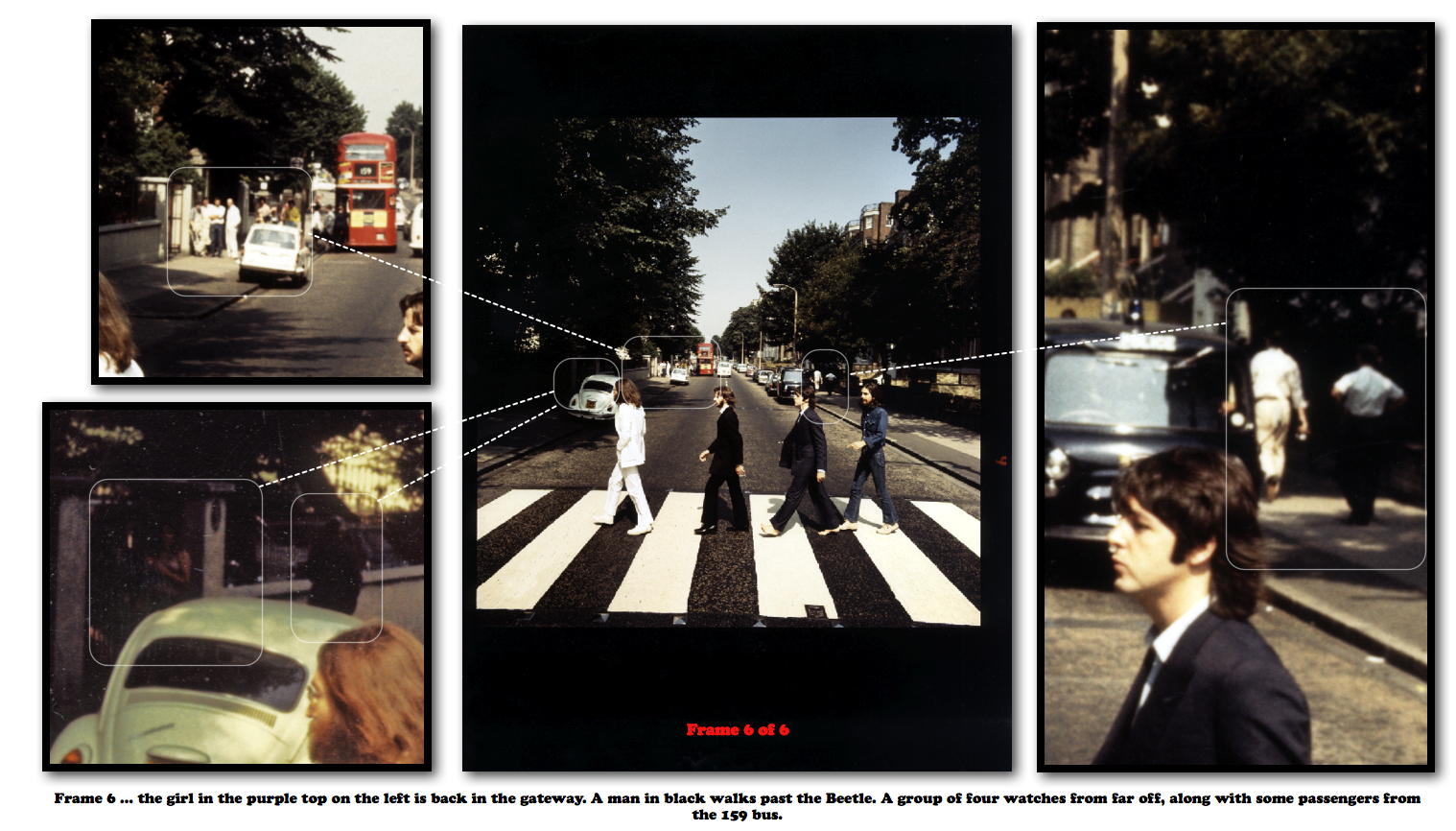 At first glance, there are some interesting differences. Although Paul McCartney was famously barefoot on the cover, he actually appears in sandals in the first two of the six frames. He only appears with his cigarette in one frame – the actual cover. Interestingly the second Paul, Paul Cole, very nearly didn’t make it onto the cover. In the frame immediately preceding the cover image, and the frame straight after, he simply isn’t there.