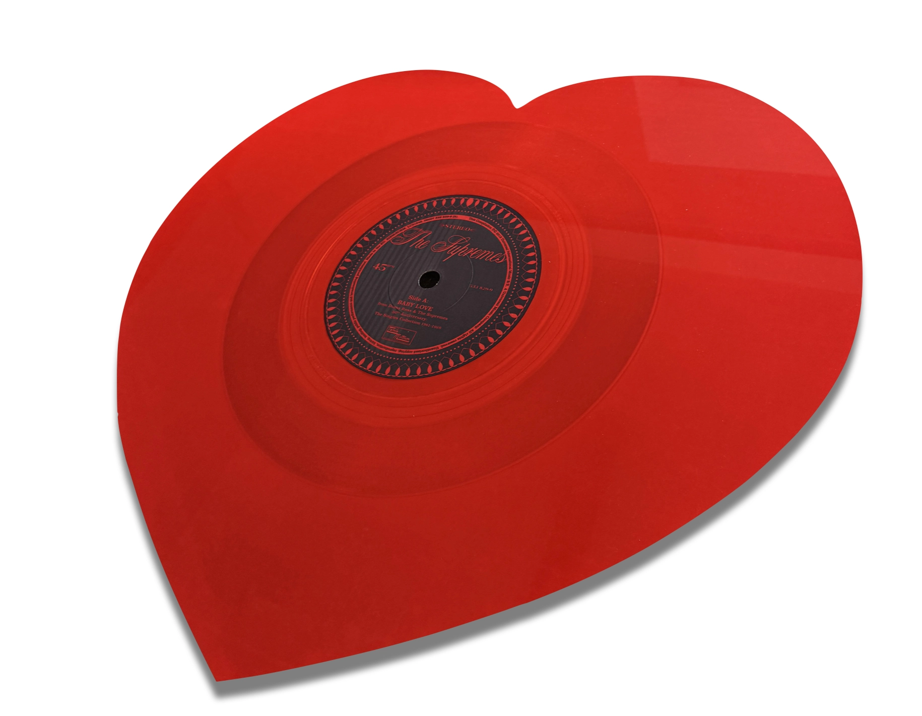 Just the thing for Valentine’s Day. Baby Love by the Supremes on heart-shaped red vinyl in a three-dimensional supersize ChromaLuxe print courtesy of our Temple of Wax service.
